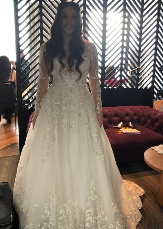 שמלת כלה צנועה, יוקרתית נוצצת משולבת סוגים של בדי תחרה עם חרוזים ורקמת יד עדינה בהשראת שמלת כלה Sofia. שמלה נפוחה עם שובל ארוך המוסיף אפקט דרמתי ואלגנטי לחיטובי הגוף. השמלה בעלת שרוולים ארוכים עם בדי אילוז’ן משולבים תחרה עדינה.