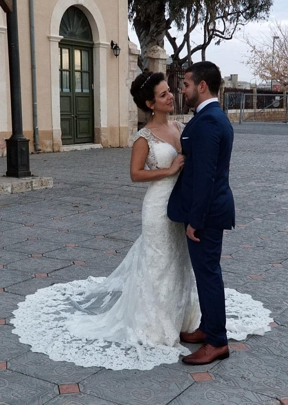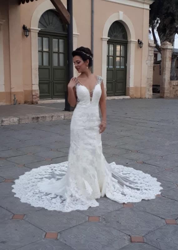שמלת כלה מרהיבה עשויה בדי תחרה שופעים עם שובל ארוך להשלמת מראה נסיכותי. שמלה עם מחשוף V עמוק מעוצבת עם כתפיות שזורות חריזה ותחרה יוקרתית. שמלת כלה קלאסית במראה יוקרתי ייחודי.