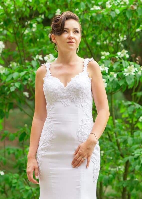 שמלת הכלה של דינה עוצבה בסגנון וינטג’ קלאסי. שמלת כלה צמודה אשר מתרחבת באיזור הברכיים ומאריכה את קו הגוף הנשי. שמלת הכלה של דינה נתפרה בחלקה העליון על ידי בדי תחרה עשירים וחלקה התחתון בבדי שיפון. אל שמלת הכלה התווסף שובל ארוך אשר העניק מראה רומנטי, אלגנטי ונסיכותי לכלה המקסימה.