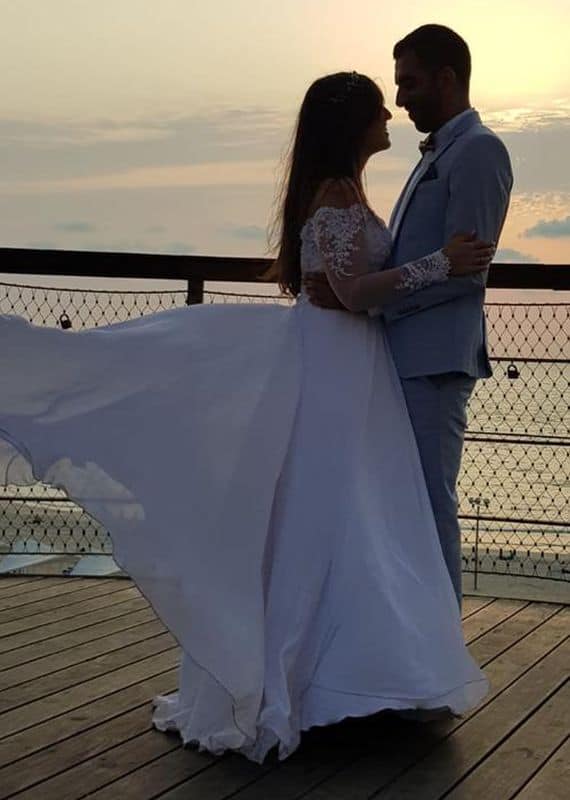 שמלת כלה אלגנטית עם שרוול ארוך עשוי תחרה וחריזה ייחודית. שמלה מעוצבת בקווים רכים הנותנת מראה פייתי, מתוק, יוקרתי ורומנטי.