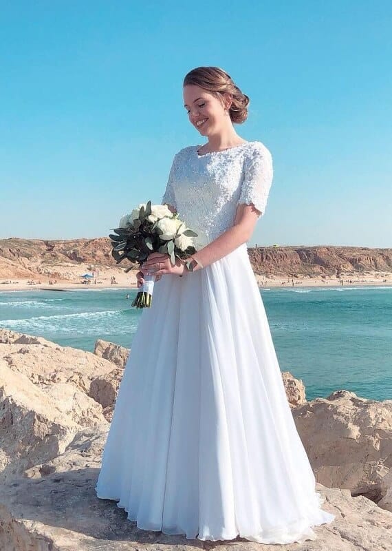 שמלת כלה קלאסית, לא נפוחה, מעוצבת בגזרה צנועה עם שרוולי תחרה קצרים וחצאית A נשפכת בקו זורם. שמלת כלה קלילה, עדינה ורומנטית, מתאימה לחתונה בטבע או בחוף הים.
