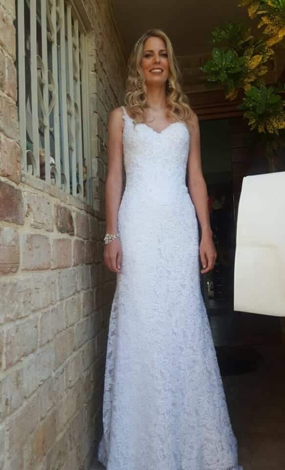 מיטל לבשה ביום חתונתה שמלת כלה רקומה תחרה מחורזת איכותית, מעוצבת בגזרה צמודה עם גב פתוח ושובל אצילי המעניק מראה וינטג’ מרהיב ומוסיף אלמנט של אלגנטיות לשמלה.
