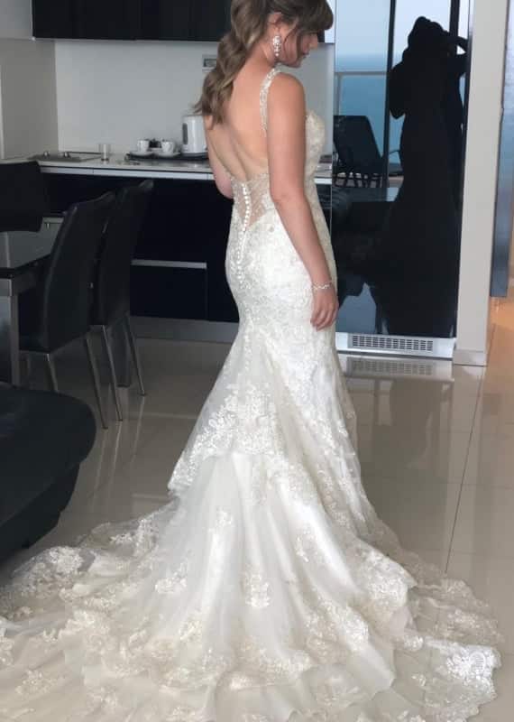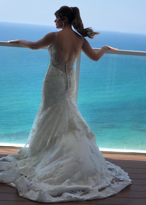 שמלת כלה נוצצת ומיוחדת במינה עם שובל ארוך ומשתרך המוסיף נופך עדין ואלגנטי לשמלה. שמלה עשויה חרוזים חרוזים משולבים בינות בדי תחרה והמשי עם מחוך בעל מחשוף. צידה האחורי של השמלה טומן גב פתוח עם שיפולי שמלה צמודה עד למותן. שמלה יוקרתית עם אפקט דרמתי אצילי.