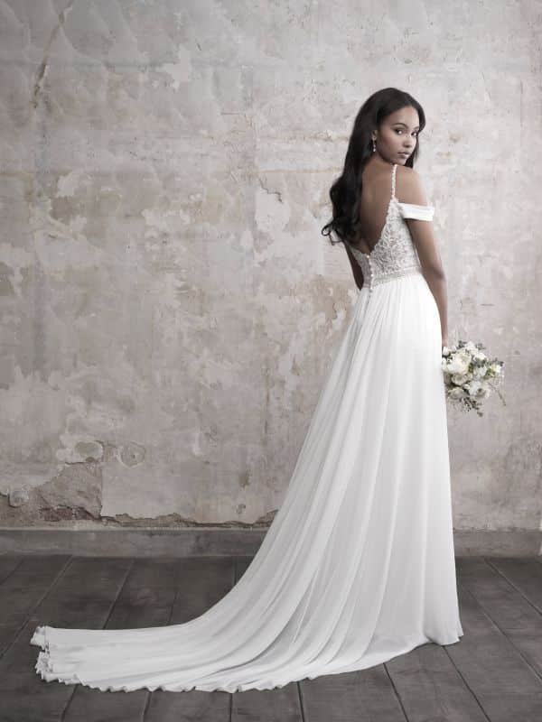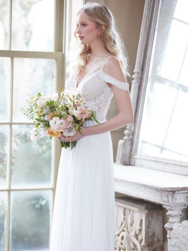 שמלת כלה קסומה ומרתקת בקו בוהו מודרני המגיעה עם נוכחות קלילה ובוהמיינית מצד אחד אבל הכי אלגנטית ומרשימה מצד שני, משולבת בחלקה העליון בתחרה יוקרתית וחצאית שיפון עשירה הנותנת לשמלה מראה ענוג מאוד רומנטי ורך.