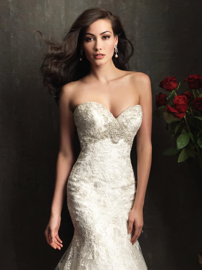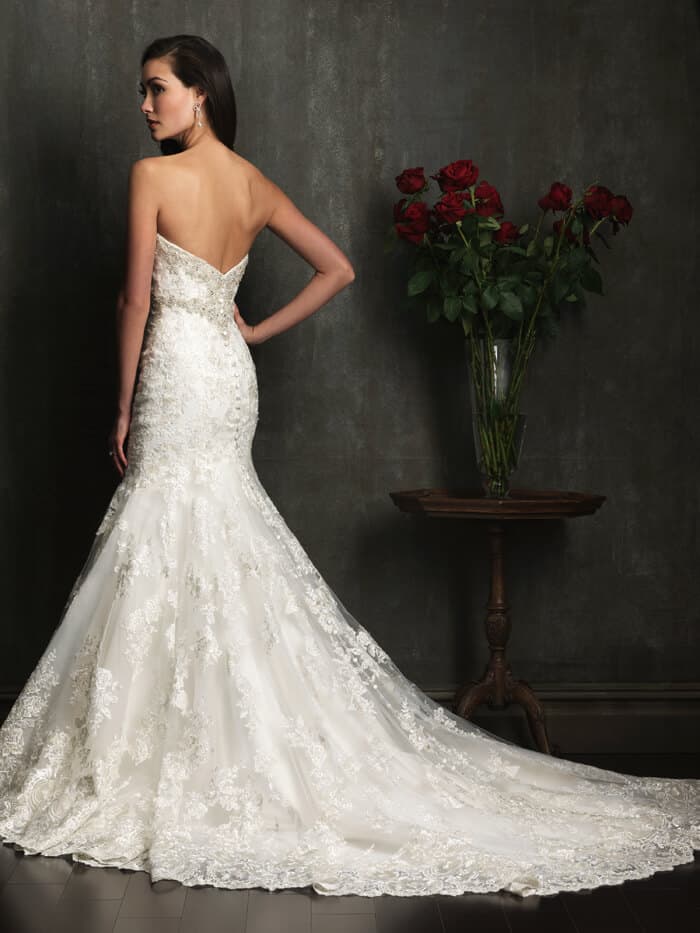 שמלת כלה סטרפלס קלאסית בגזרה צמודה וסקסית בסגנון בת הים עם גב פתוח וכתפיים חשופות.