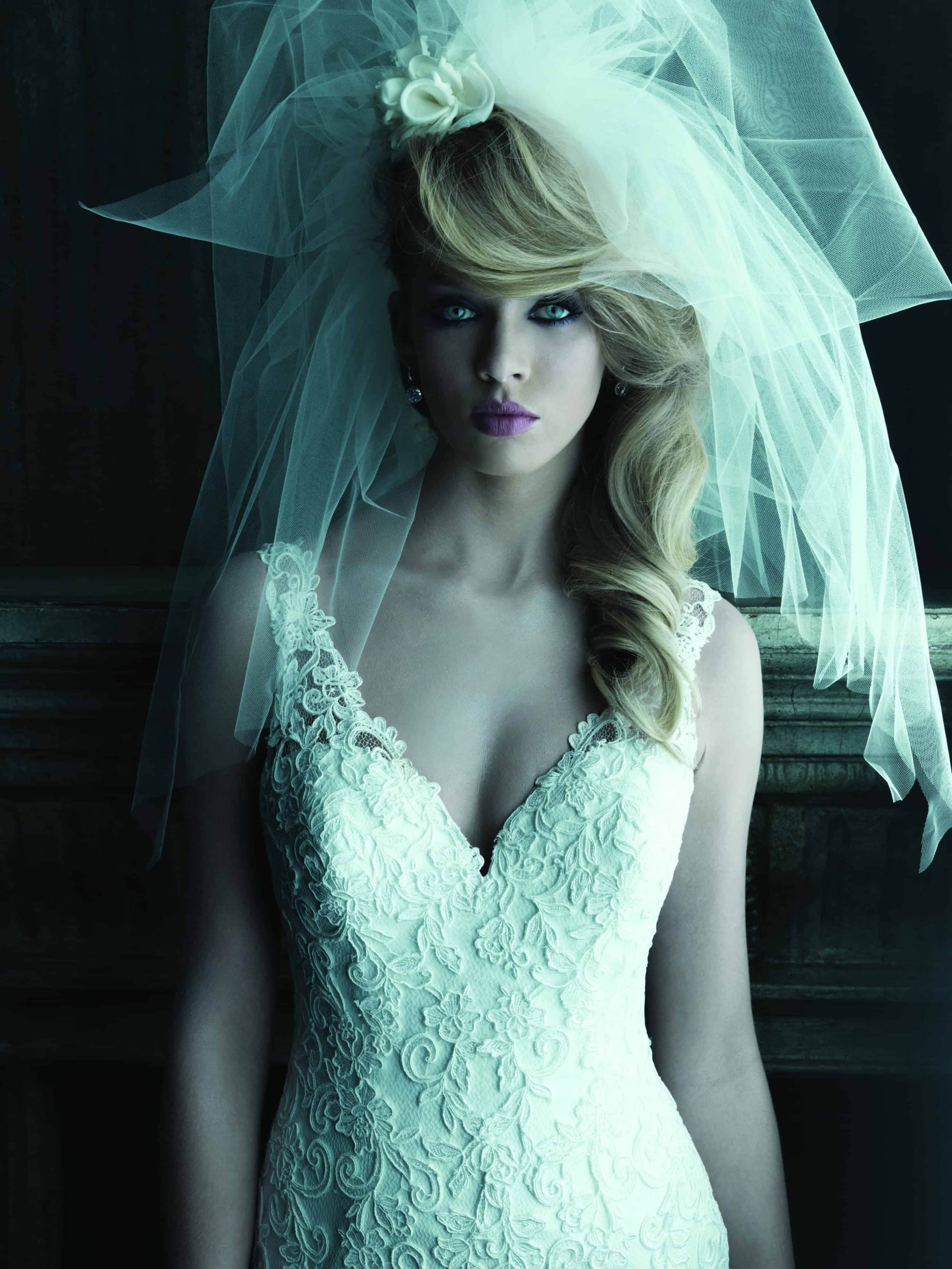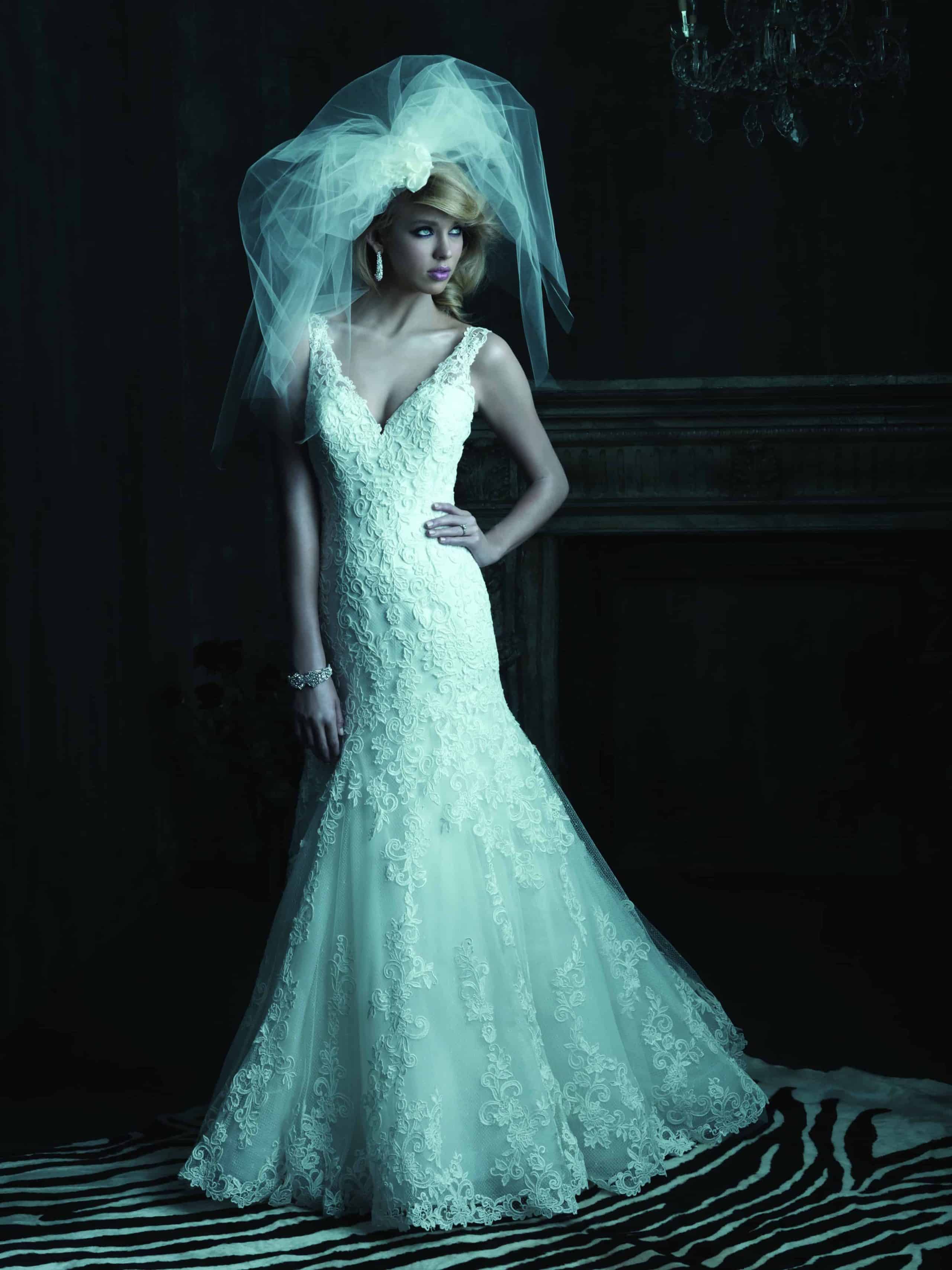 שמלת כלה עם כתפיות צרות ומחשוף V עמוק למתן מראה נשי מחמיא ואצילי.