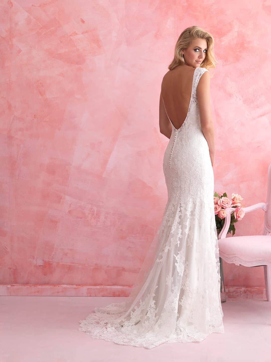 שמלת כלה קלאסית מעוצבת בקו נקי עשויה תחרה עדינה בגזרה מחמיאה וזורמת על הגוף בנוחות מרבית.