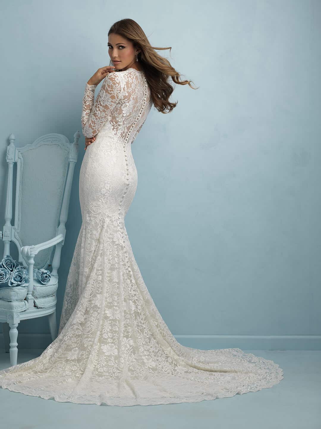 שמלת התחרה בעלת שרוולים מדהימים המסתיימים במחשוף V עמוק ומרשים, גב השמלה סגור בתחרה התפורה בשקיפות עד אזור המותן, המרשים ביופיו ומשאיר מקום לדמיון, הגב נרכס בכפתורי בד מושלמים המסתיימים בשובל מתפרץ שכולו תחרה ועשיר מאוד.